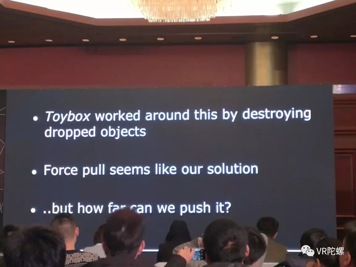 但在抓取过程中,我们还发现了一些问题。用户经常会很远距离去尝试抓他肯定抓不到的东西,或者说对于深度判断不是那么准确,明明没碰到,就认为碰到,按抓取键。所以我们加入了一些感知的反馈系统,因为人类的感知系统是很敏感的,一旦反馈给他,他能比较清楚地知道发生了什么情况。比如,通过振动反馈,手慢慢接近物体时,就开始有微小的振动,随着距离越来越接近,振动感越来越强劲。这样能很好地判断玩家的手是不是离它越来越近。另外,通过颜色来区分。用一个后处理材质把用户当前能抓到的东西高亮表现出来,当他发现哪个东西变成黄颜色,就会按下抓取键。即使不是玩家想要的,经过大脑的反馈以后,也可以抓过来扔掉,再去抓想要的东西。