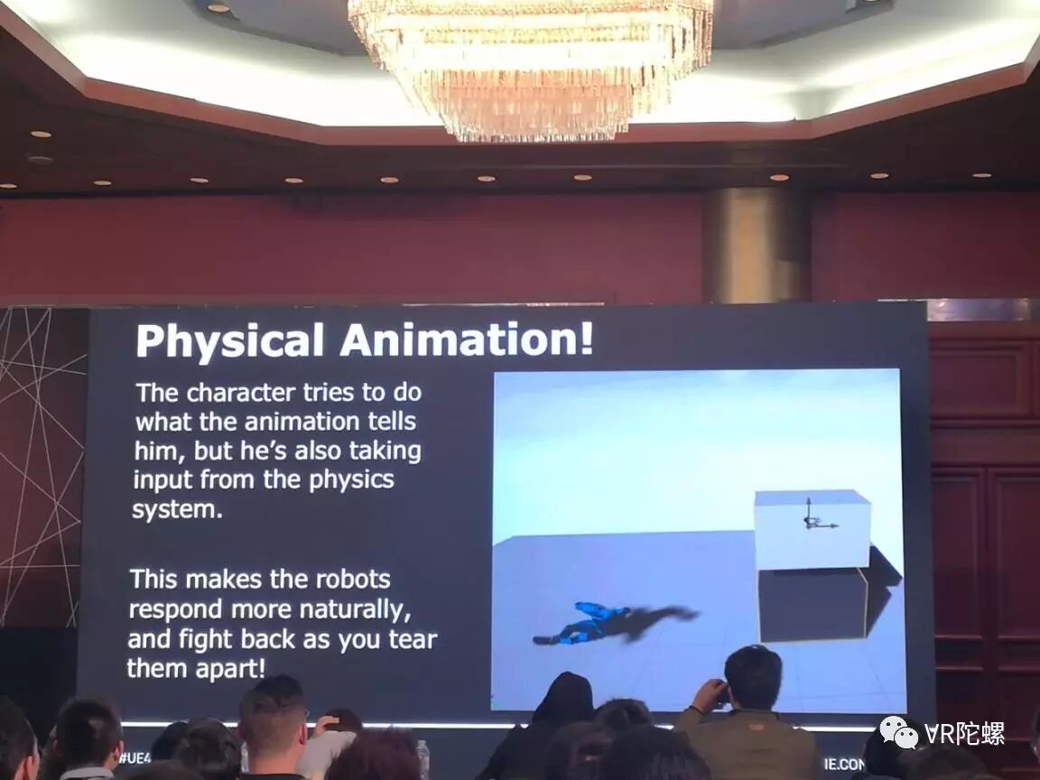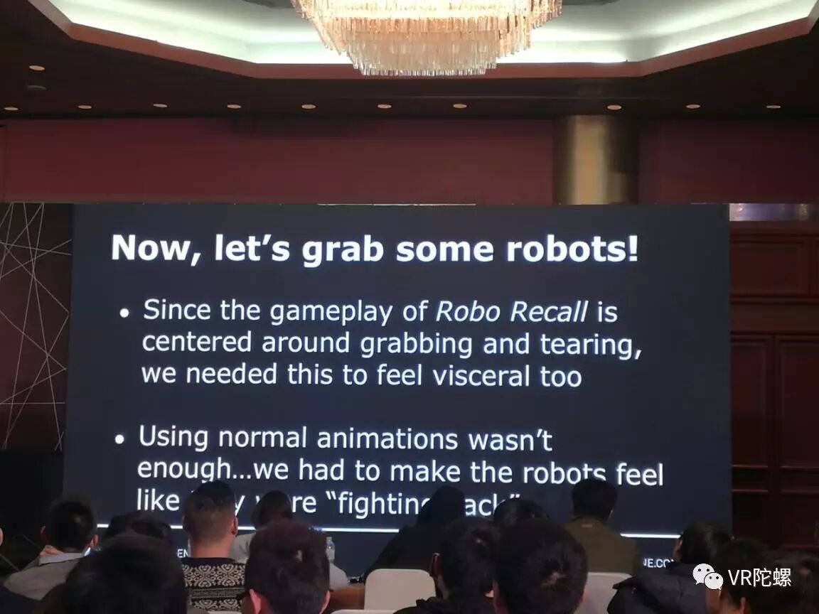 《Robo Recall》里有一个很重要的设计是同时可以抓这些机器人,那么第四个问题是机器人被抓以后像死掉了一样,看起来没有任何反抗。基于此我们加了物理动画的功能。比如在《Robo Recall》里面,那些机器人被枪打到的时候,他除了在做正常的动画,也会有受物理冲击以后的物理效果,两者可以混合到一起。