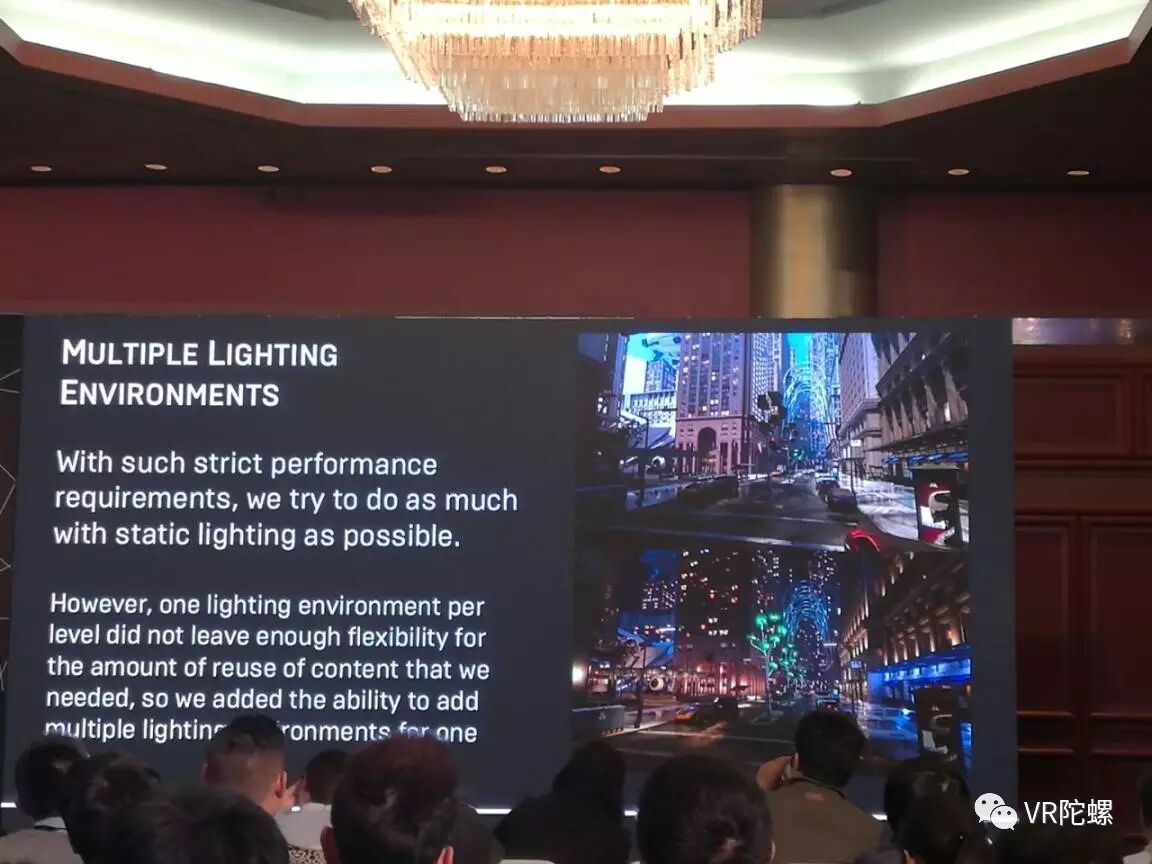 接下来我们要讲一些功能在4.14里面有的场景,主要我们希望能使用同样的《Robo Recall》表现不同的环境效果,比如一个城市有夜景也有白天的场景,我们尽可能用静态的光照来做场景的光照环境。因为都是静态的光照所以相率还是相当高的。