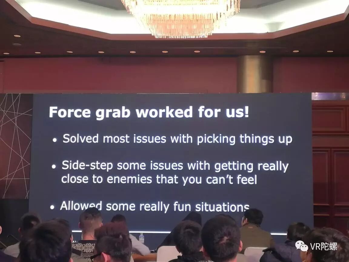 第三个问题是朝向的标准。比如说如果我们把抓取的延伸的朝向按照你手的朝向来做,那如果玩家是瞄着它用手来,其实是很简单的。但是当物体在玩家手斜下方时,玩家是抓不到的。如果知道机制是工作的,其实是有很好体验的,但如果不知道,玩家就会很厌烦。