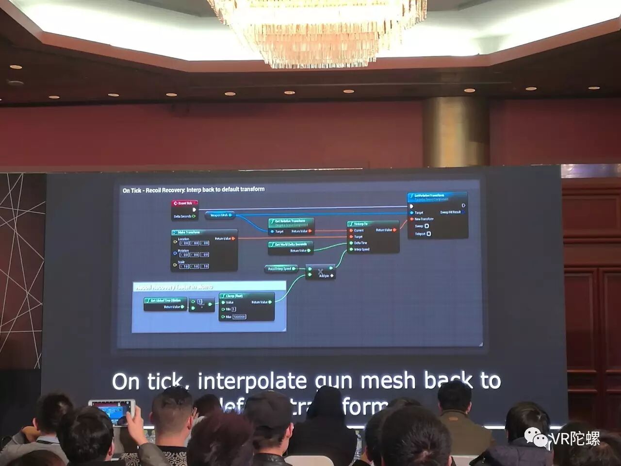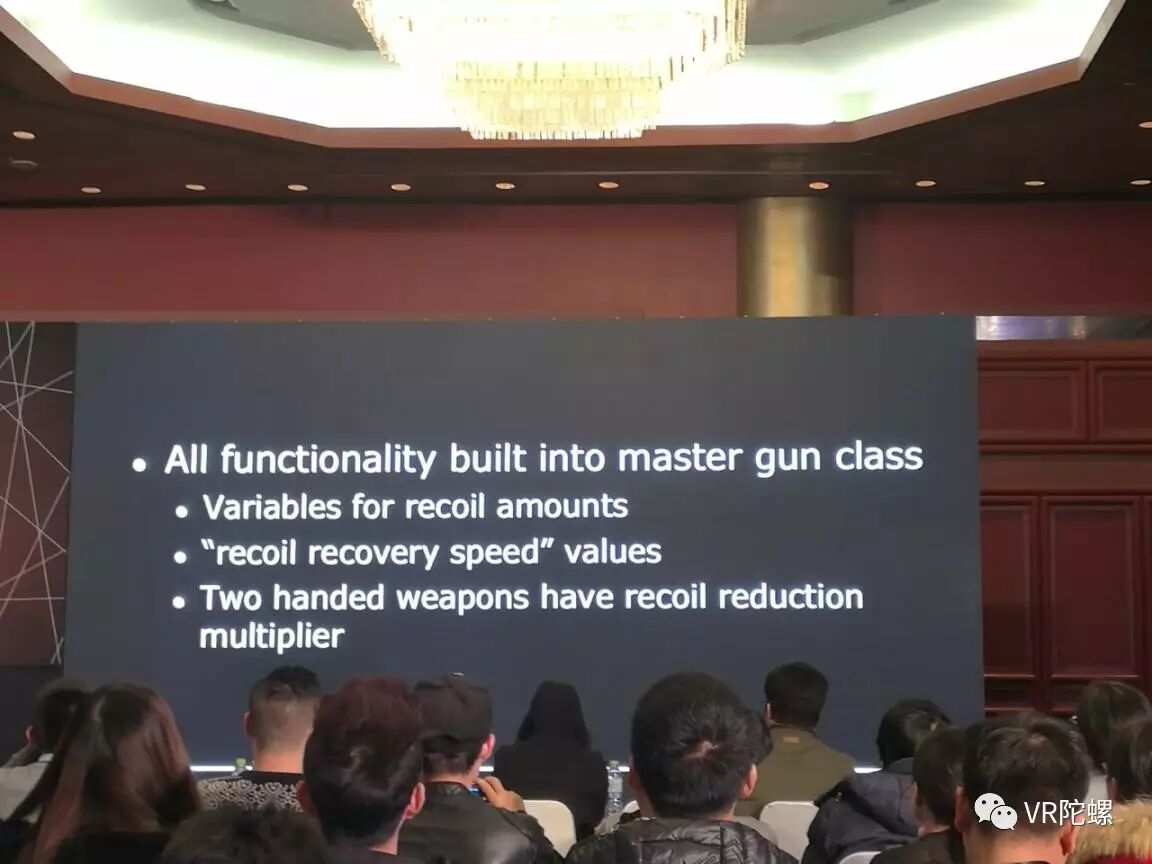 首先,VR里都想要降低延迟,但是对于枪是有问题的,因为枪是有重量感的,如果过快地挪动是不太可能的,所以反而加一些延迟。我们把前期帧的速度累计起来,让它更有重量感。虽然没办法让实际的物体变重,但是可以让玩家感受到好像它的重量变化了。