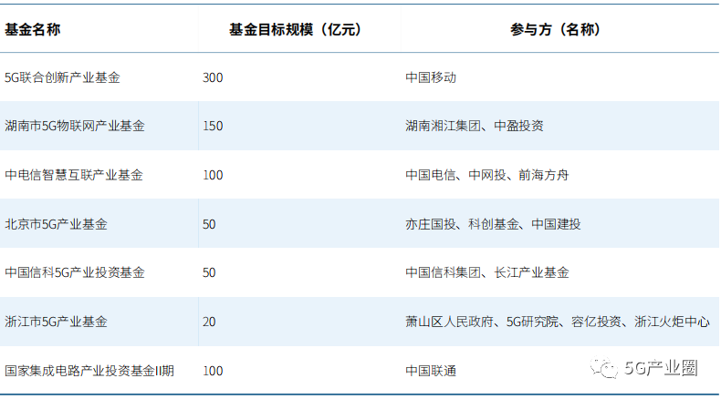 具备产业背景的企业与市场化投资机构合作密切(国家集成电路产业投资基金II期规模达2000亿元,其中部分资金将投资于5G领域,各行业参与者众多),5G行业专业能力和市场投资专业能力的组合成为产业基金的标准配置。