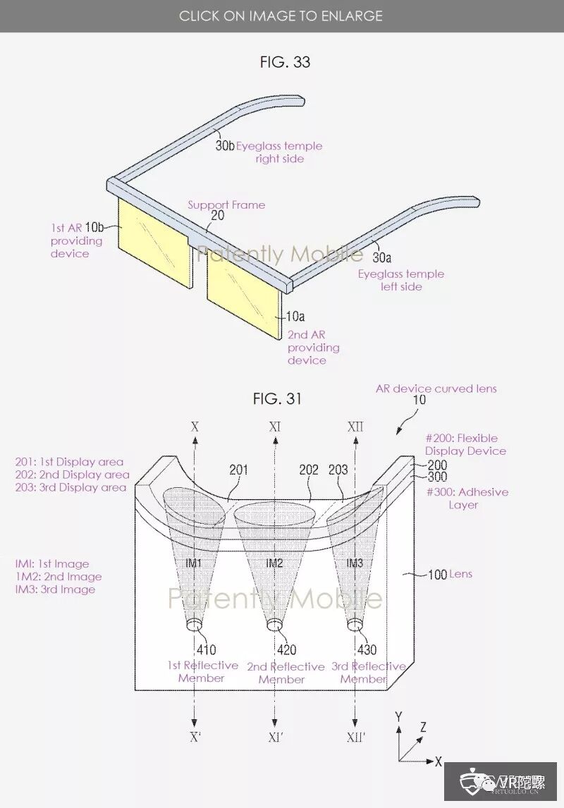 据三星的专利图,图33展示了一款AR眼镜,其包括2块“增强现实提供设备”(#10a及#10b)、支撑框架#20以及眼镜腿#30a和#30b。图31展示了增强现实提供装置,是一款弯曲透镜的透视图。