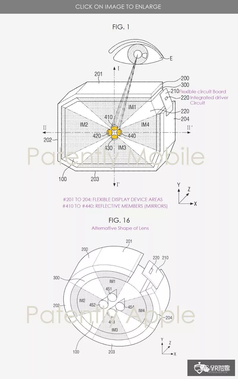 为了扩大柔性显示设备#200的眼睛E可见的区域,即用户的视场角(FOV),透镜可以包含多个反射构件#410、#420、#430和#440。