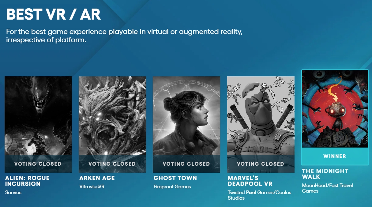 年末颁奖季,被誉为“游戏界奥斯卡”的The Game Awards于周五召开,由MoonHood开发的《午夜漫步》击败《死侍VR》《异形 侠盗入侵》等劲敌,荣获“最佳VR/AR游戏”;Unity Awards 2025则把“最佳AR/VR游戏”颁发给了《Ghost Town》;由于入选作品的时间范围关系,XR Awards 2025的“年度XR游戏”获奖者是《Batman: Arkham Shadow》。
