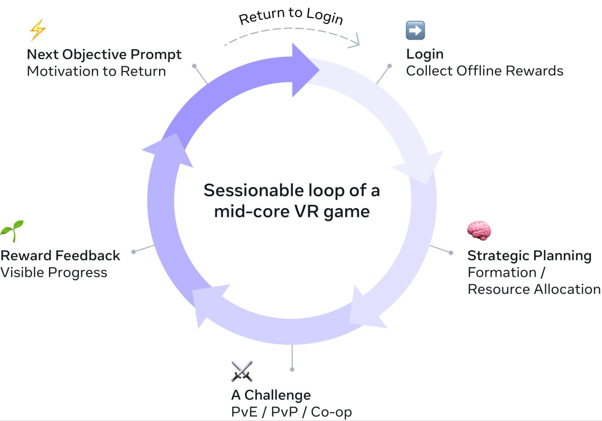 “中核游戏的成功源于低摩擦操控、高策略回报与长期目标。这些支柱与VR游戏独特的沉浸流程天然契合——主流杂食型玩家能在舒适自主的节奏下探索3D环境。在此情境下,玩家更倾向于20分钟的沉浸式体验,强调有意义的决策并减少操作疲劳,而非依赖高体能消耗的机制。”