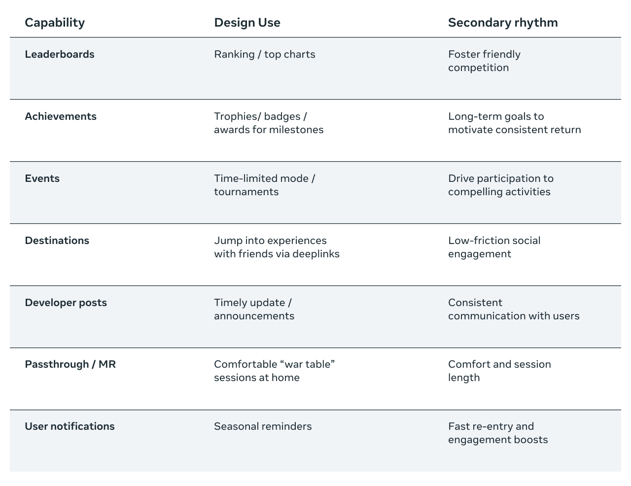 Meta Horizon OS 内置平台功能可直接提升用户留存率。开发者可按以下方式调整设计与系统功能:Meta Horizon OS 平台功能 → 留存杠杆