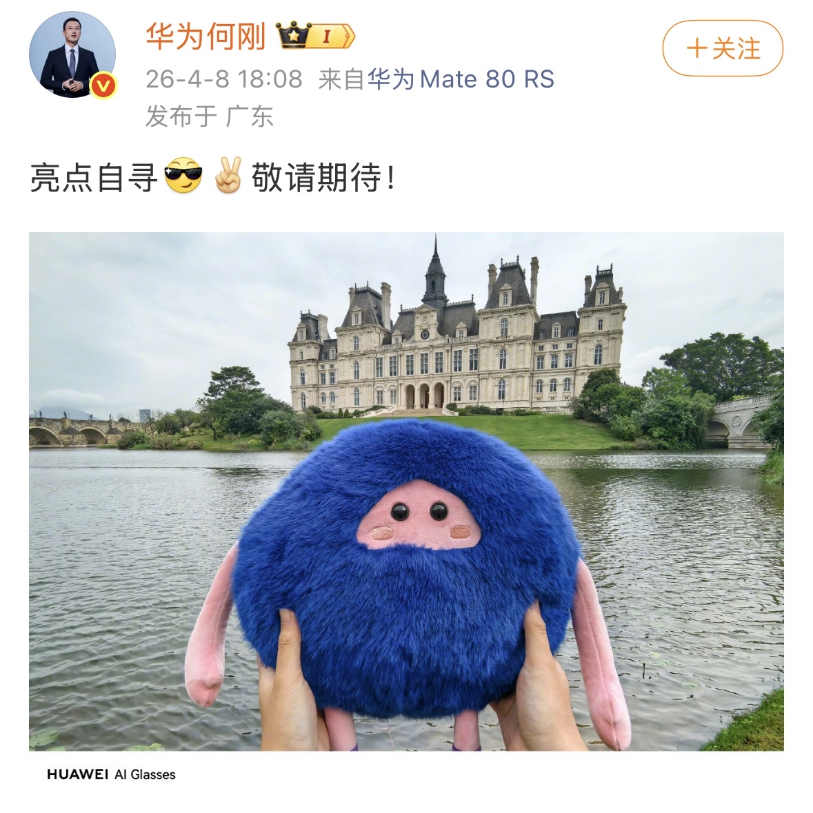 2026年4月8日,华为终端BG CEO何刚通过社交平台发布一张实拍照片,左下角清晰标注 "HUAWEI AI Glasses" 水印。此举为华为首款具备独立影像能力的AI眼镜提供官方实锤,标志着新品进入发布倒计时。