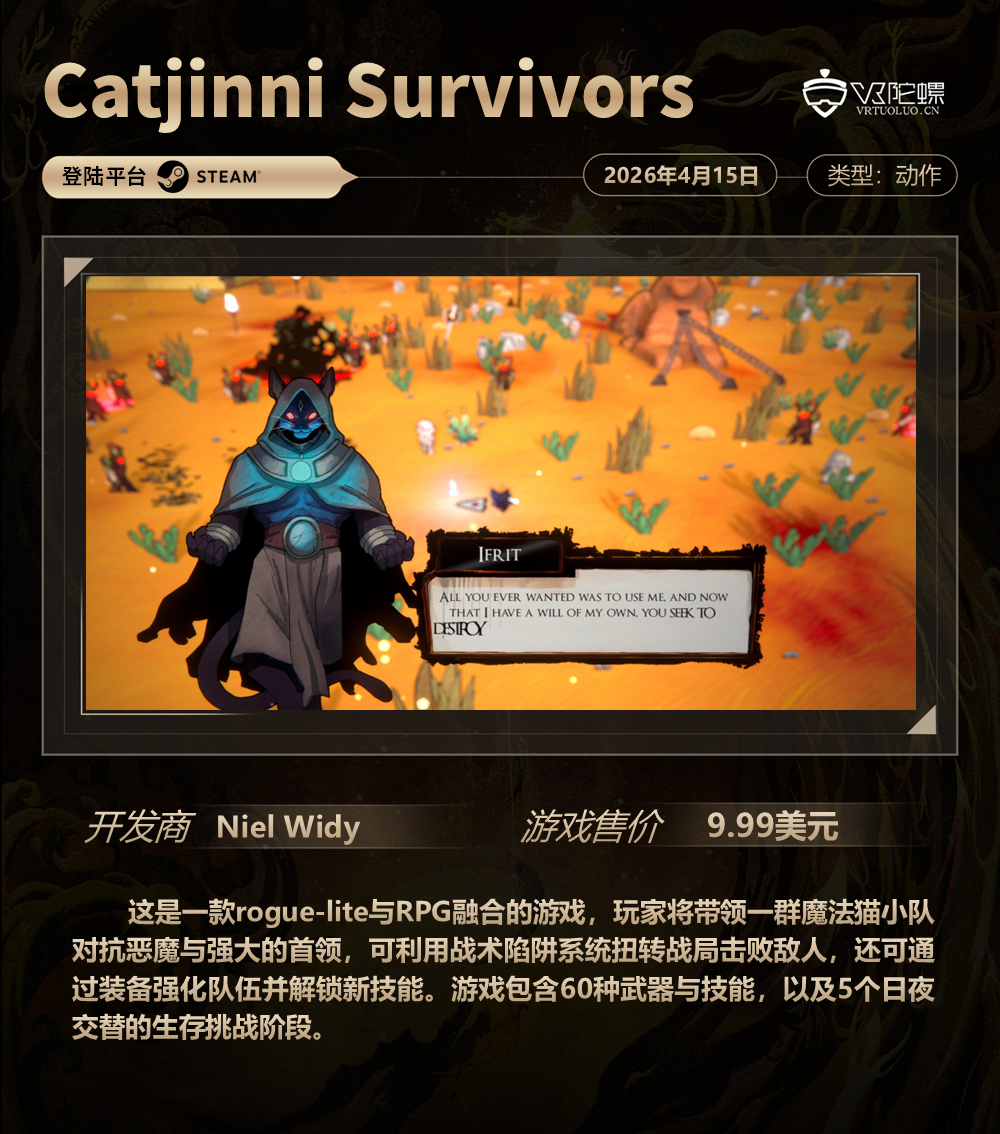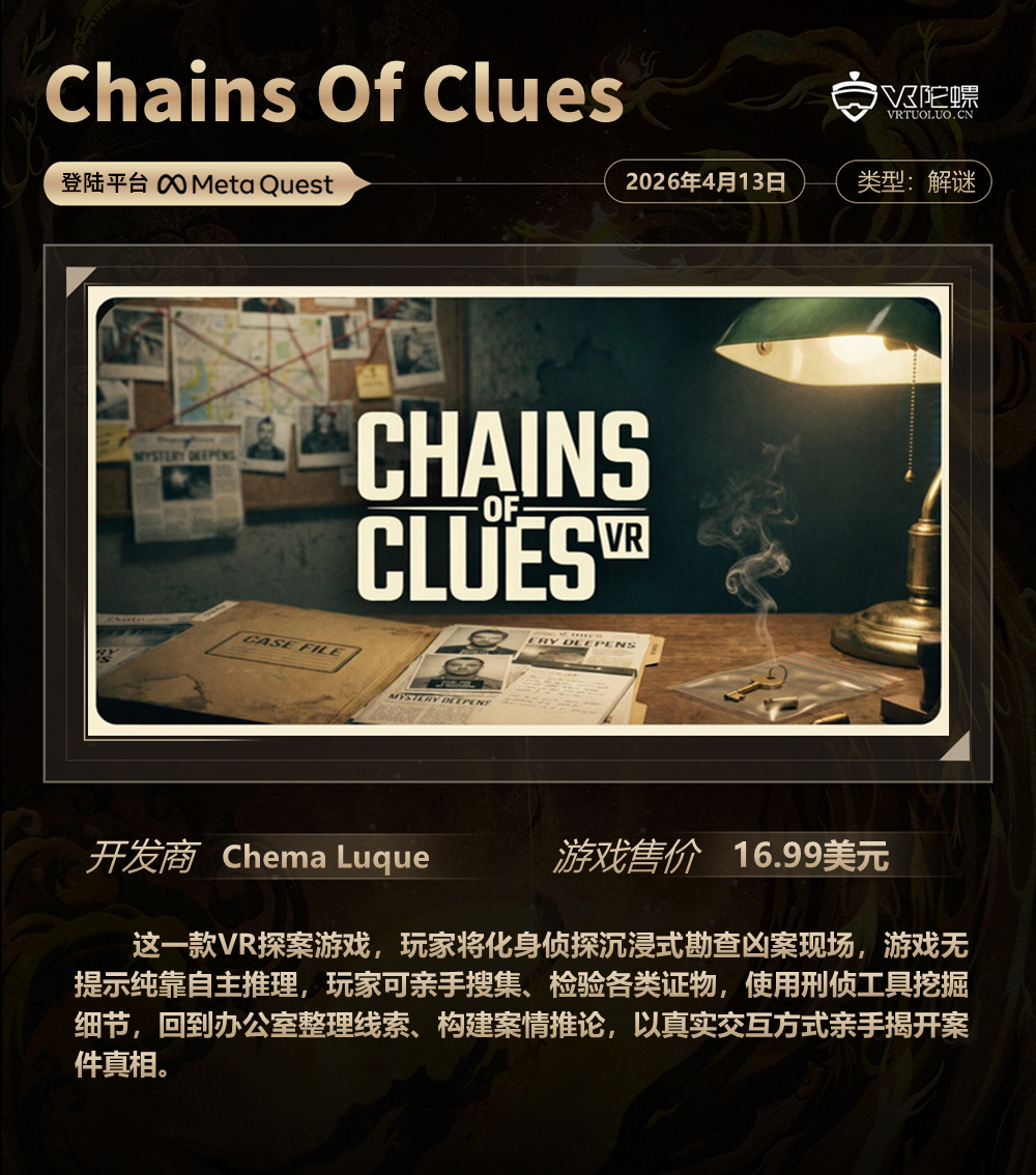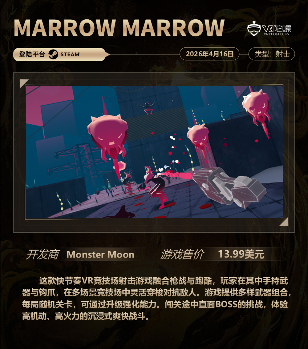 VR游戏周报·第188期,统计4月10日~4月16日期间上线的VR游戏,新作介绍共计5款,后文按照发售时间排序。截至2026年4月16日,各主要VR平台的内容数量如下: