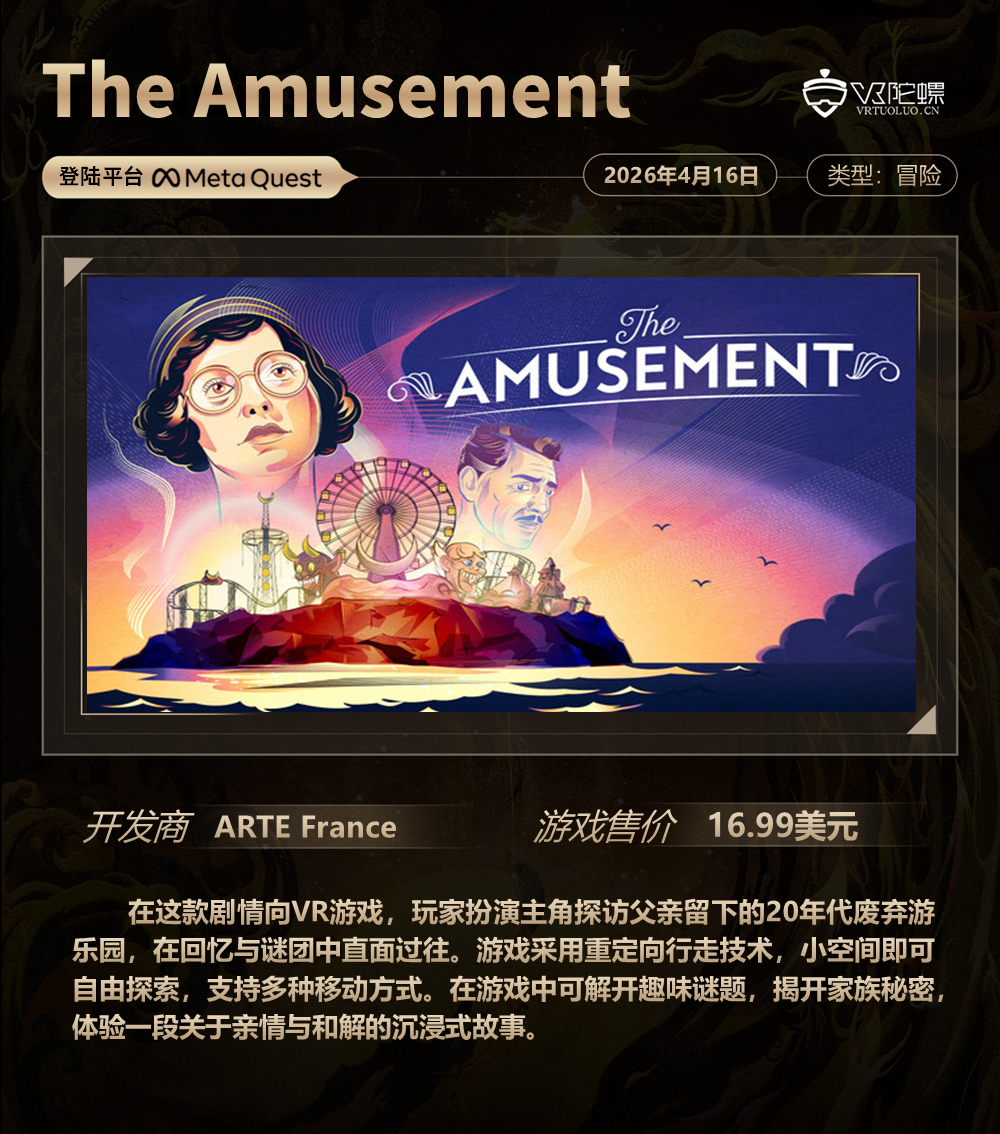 此外,一款剧情向VR游戏《The Amusement》已同步登陆Steam及Quest平台,玩家将扮演主角探访父亲留下的20年代废弃游乐园,游戏带有一定悬疑解谜色彩,可通过游戏出色的叙事体验一段关于亲情与和解的沉浸式故事。